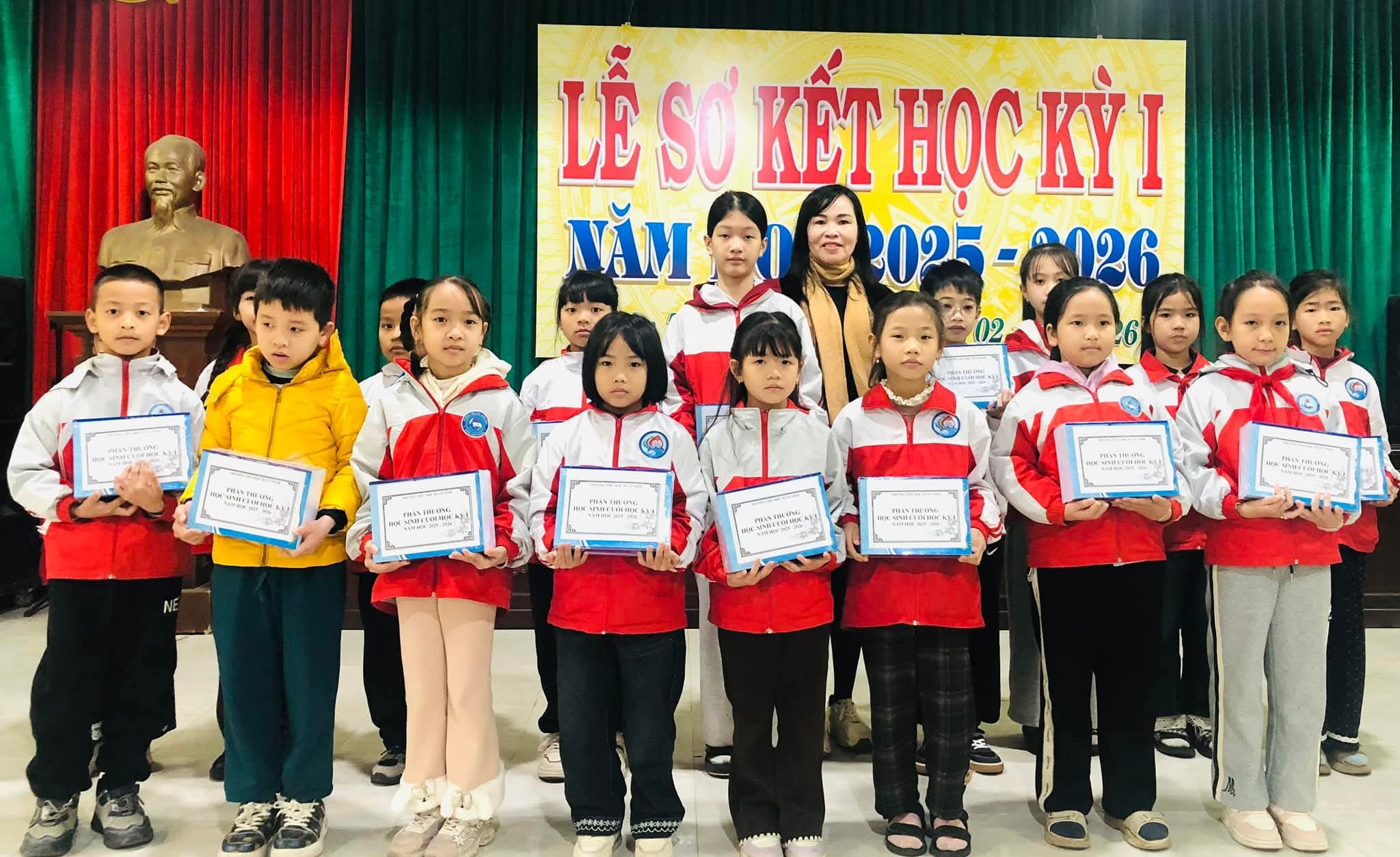 Trong Lễ sơ kết học kì 1, nhà trường đã tổ chức trao phần thưởng cho những học sinh đạt thành tích cao trong học tập và rèn luyện học kì 1, trao quà “Nồi bánh chưng yêu thương” cho những học sinh có hoàn cảnh khó khăn và cho học sinh đọc cam kết nhân dịp Tết nguyên đán Bính Ngọ 2026.