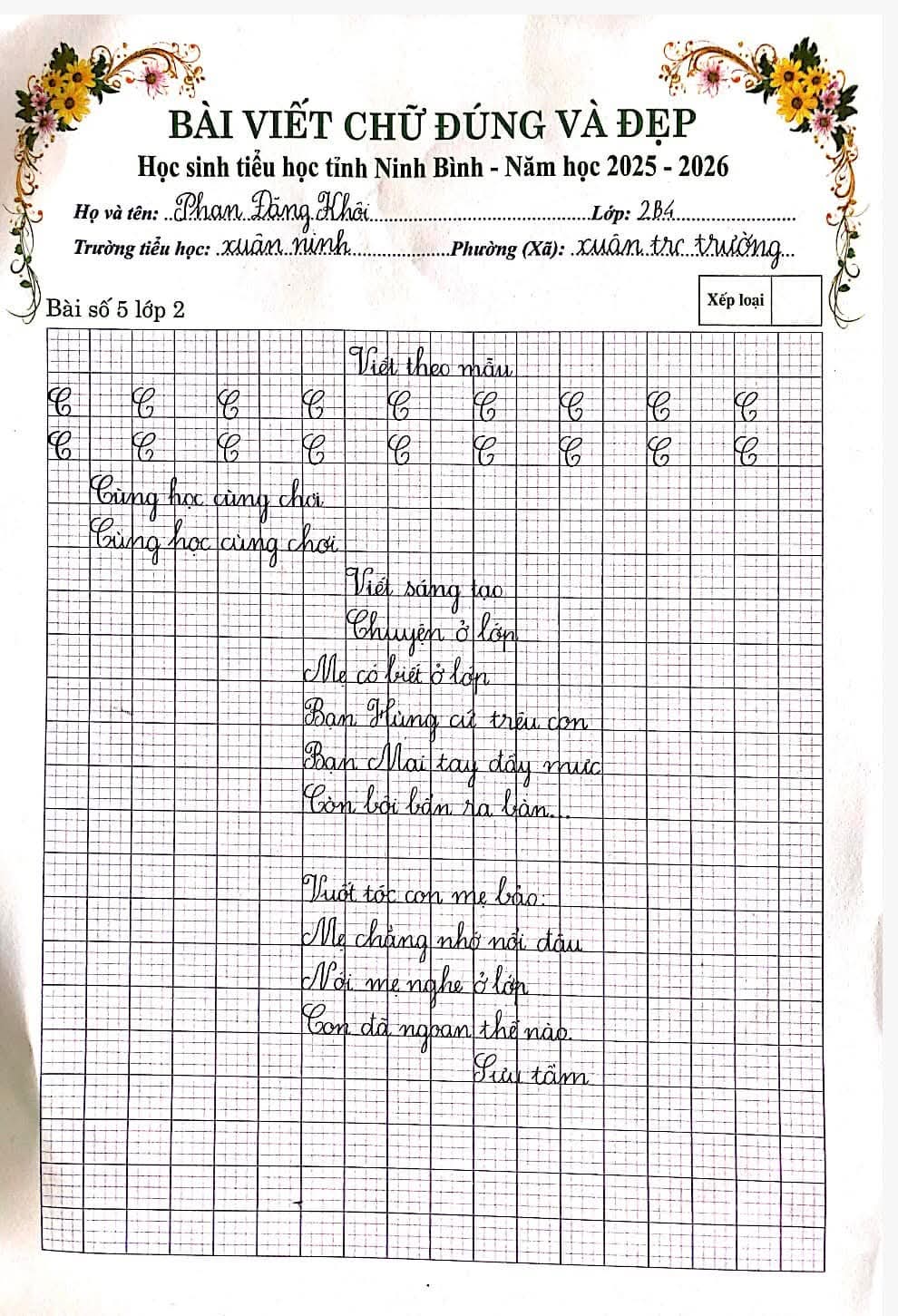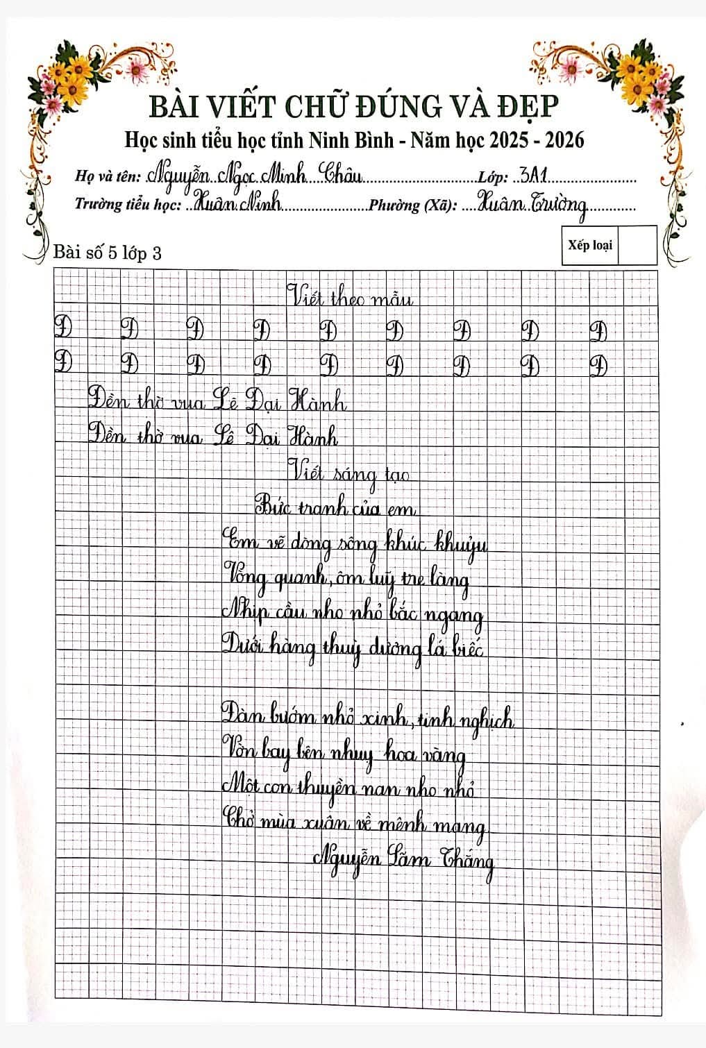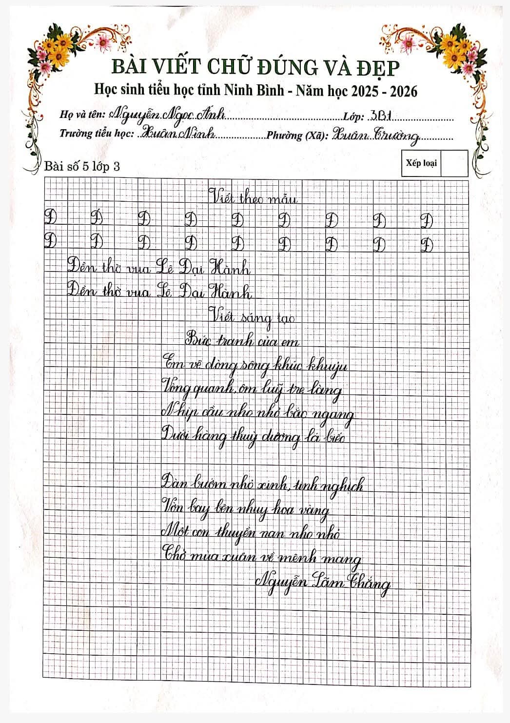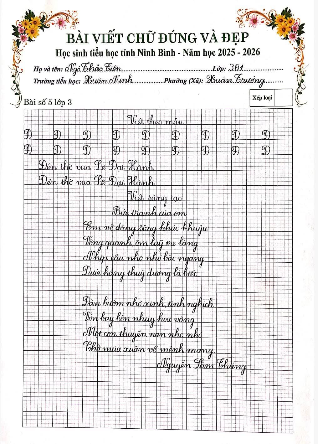 🌷“Nét chữ – Nết người” từ lâu đã trở thành một giá trị đẹp trong giáo dục tiểu học. Việc rèn luyện chữ viết không chỉ giúp học sinh viết đúng, viết đẹp mà còn góp phần hình thành tính cẩn thận, kiên trì và ý thức học tập nghiêm túc. Nhằm tiếp tục duy trì và phát huy phong trào “Giữ vở sạch – Viết chữ đẹp”, chiều ngày 06/3/2026, Trường Tiểu học Xuân Ninh đã tổ chức Cuộc thi “Chữ viết đúng và đẹp” cấp trường với sự tham gia của nhiều học sinh tiêu biểu từ các khối lớp.
