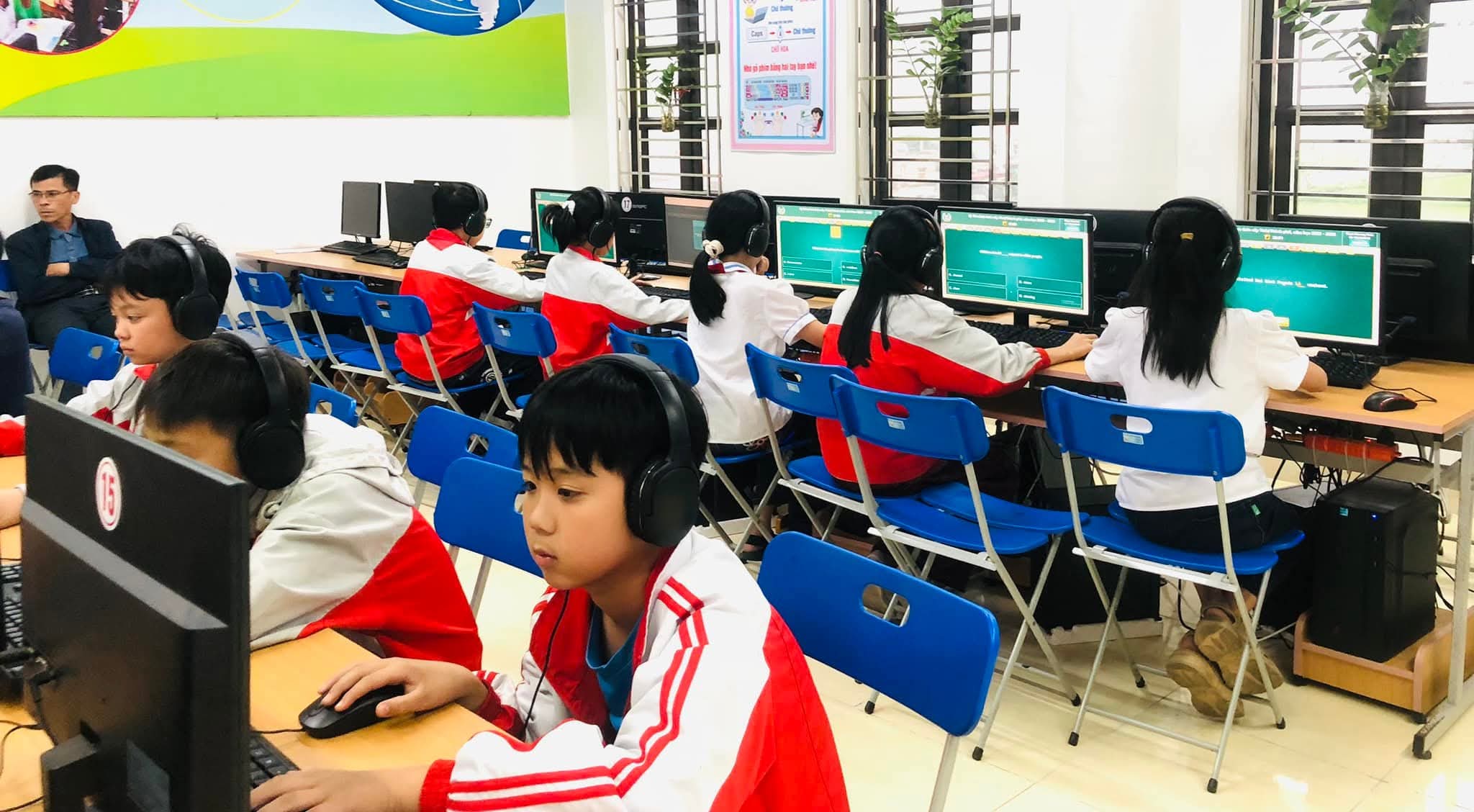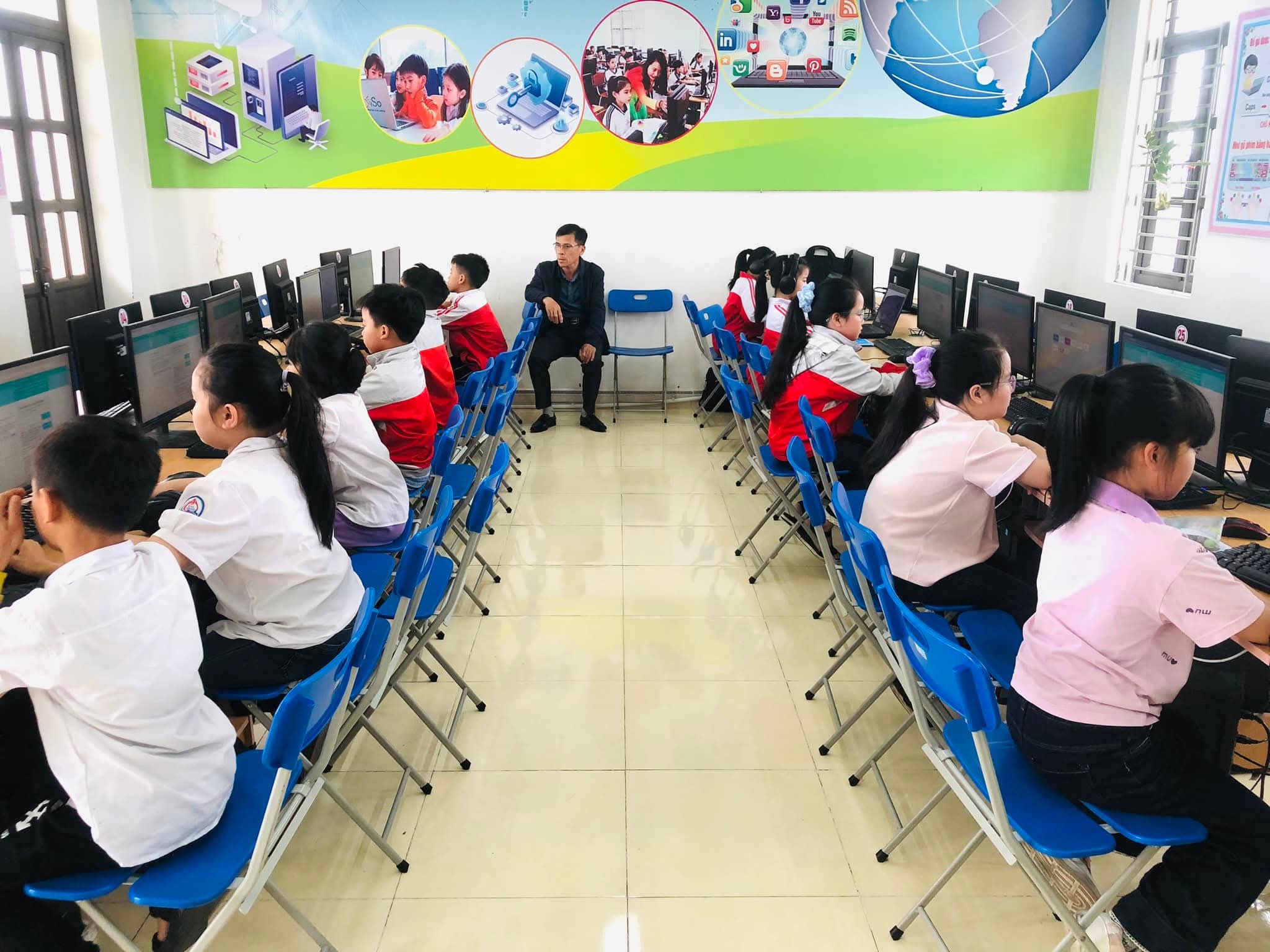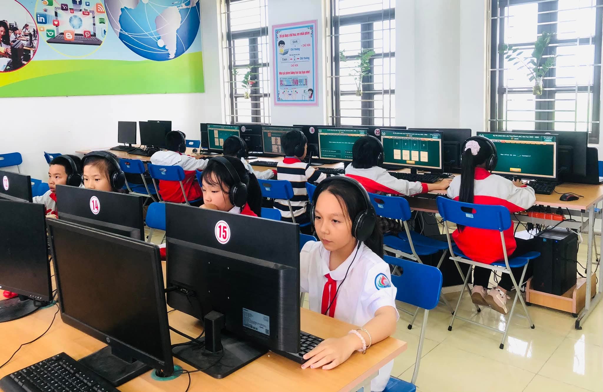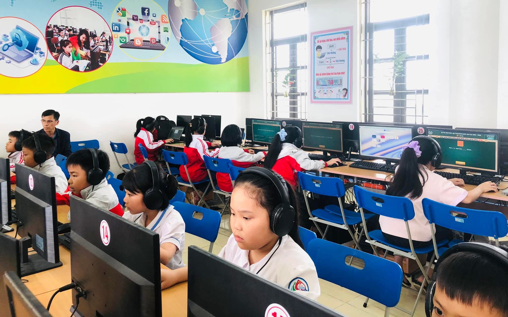 Chiều 09/03/2026, nắng xuân như rạng rỡ hơn tại các phòng máy của Trường Tiểu học Xuân Ninh. Không gian yên tĩnh lạ thường, chỉ còn tiếng lách cách của bàn phím và những ánh mắt hồn nhiên nhưng đầy quyết tâm đang dõi theo từng câu hỏi Tiếng Anh trên màn hình máy tính. Đó là khoảnh khắc 37 “đại sứ nhỏ” của chúng ta bước vào ca thi số 5 – nấc thang quan trọng nhất của kỳ thi IOE cấp Tỉnh năm học 205-2026.