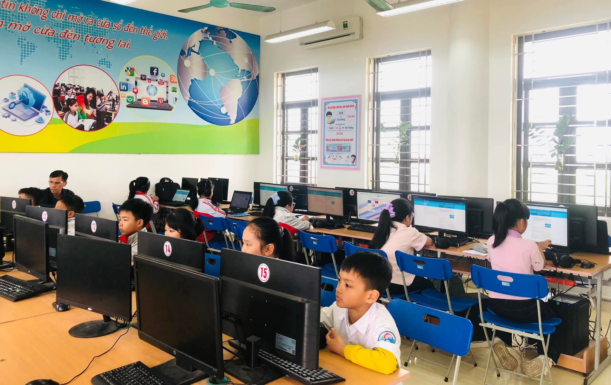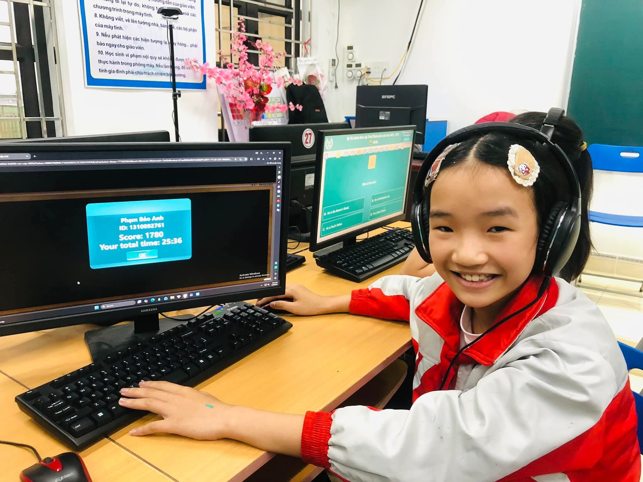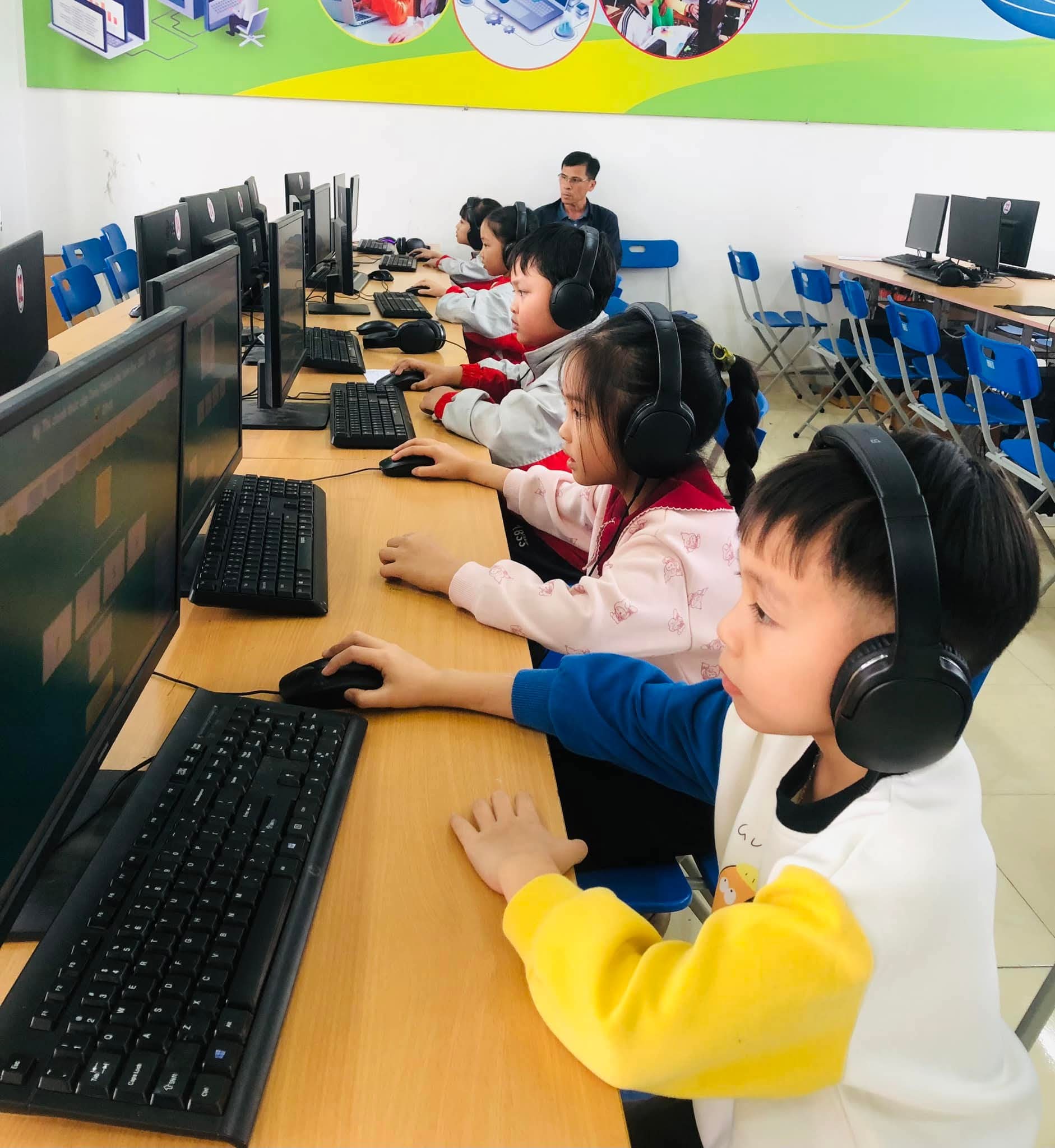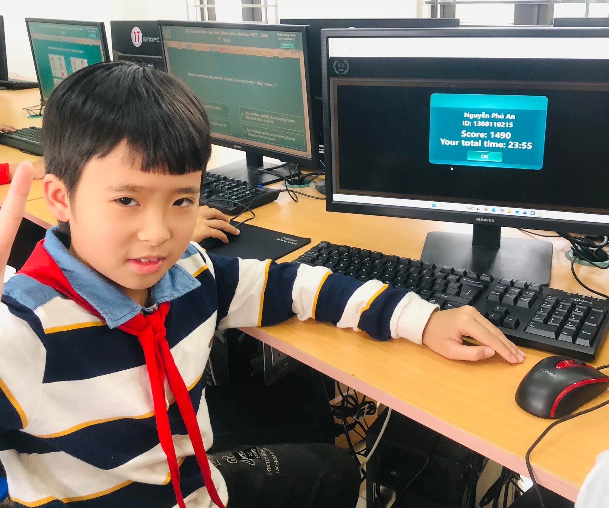 Chiều 09/03/2026, nắng xuân như rạng rỡ hơn tại các phòng máy của Trường Tiểu học Xuân Ninh. Không gian yên tĩnh lạ thường, chỉ còn tiếng lách cách của bàn phím và những ánh mắt hồn nhiên nhưng đầy quyết tâm đang dõi theo từng câu hỏi Tiếng Anh trên màn hình máy tính. Đó là khoảnh khắc 37 “đại sứ nhỏ” của chúng ta bước vào ca thi số 5 – nấc thang quan trọng nhất của kỳ thi IOE cấp Tỉnh năm học 205-2026.